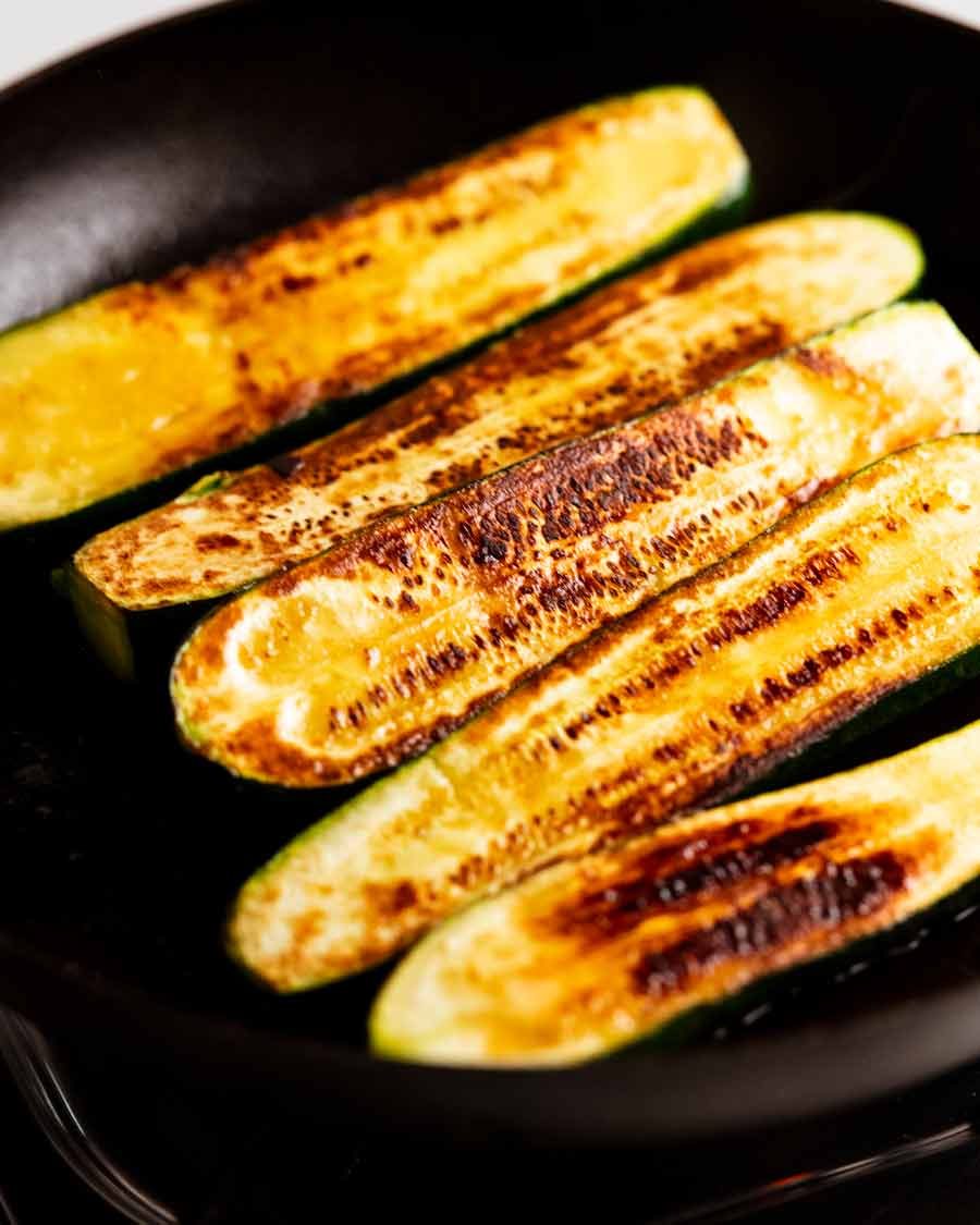 - Cook – Heat a large non-stick pan over medium-high heat. Place half the zucchini cut side down and cook for 3 to 4 minutes until the surface is golden. Turn and cook the skin side for 3 minutes. Pile onto a serving plate and repeat with remaining zucchini.