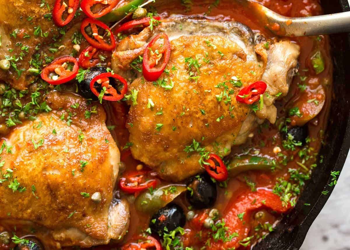 Crispy chicken in a spicy tomato sauce with capsicum / bell peppers, olives, capers. I call it an Italian Chicken Casserole because it’s stew-like, with plenty of sauce to slop up with crusty bread or to toss through pasta. A fabulous, hearty dinner you can get on the table in less than 30 minutes!