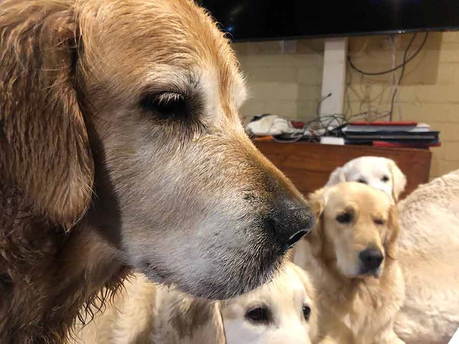 Photo from the Golden Retriever boarder while I’m in Tasmania – this is what surrounds her every morning when she’s munching on dry toast. (That’s Dozer’s big face at the front there, shoving his way to the front of the pack!).