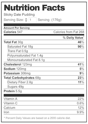 – Sticky Date Pudding is indulgent and very sweet, from both the dates + sugar in sauce. If you don’t have a sweet tooth, this dessert is not for you! To reduce sweetness, you can skimp on the sauce. Or make a lighter, less sweet sauce as follows: Use half the sugar, butter and cream, make per recipe. When it simmers, add 1 cup low fat milk, then 2 tsp cornflour/cornstarch dissolved in 1 tbsp water. Simmer to thicken. 4. Make Ahead: Exceptional for reheating because it’s so moist. Poke the holes and soak with sauce, reserve remaining sauce for serving. Best way to reheat is in the microwave because it keeps the pudding moist. 5. Nutrition per serving, assuming 9 servings and that all Sauce is consumed, which it may not be. I like to ensure there is enough Sauce because running out is a disaster. Nutrition for 7 individual puddings is 703 calories per serving. They are very generous sizes with loads of sauce (because the sauce recipe makes enough for 9 servings for the pudding cake), so when I scale the Sauce down by 20%, it reduces to 606 calories. Calories per serve for lightened up sauce (see Less Sweet Sauce above) is 477 calories.