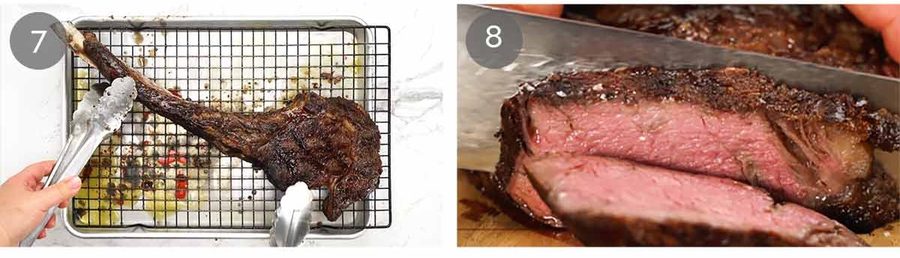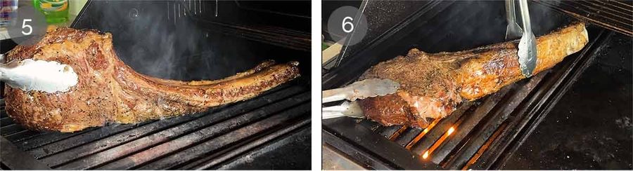 Sear 6 to 8 minutes – Sear the steak for 3 to 4 minutes per side until it becomes a deep dark brown, or until the internal temperature reaches 55°C/131°F. Adjust the heat as needed – if your tomahawk has been resting out for a while and cooled, it may take longer to reach temperature.