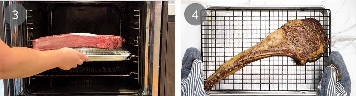 You can have the tomahawks baked even one hour ahead because even if they cool down almost to room temperature, it’s fine, as you will bring them back up to temp on the BBQ.