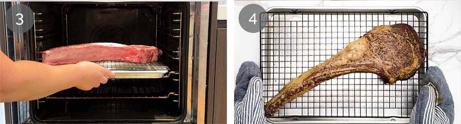 This recipe is specifically formulated for tomahawk steaks because the bone is so long, you can’t fit them in a stove-top pan. But the method can be applied to any thick cut steak 3cm / 1.2″ or thicker. For thinner steaks, I generally just cook them on the stove / BBQ because they’re thin enough to cook through relatively evenly without finishing them in the oven. See here for my favourite stovetop method – the Cheffy butter basted way!