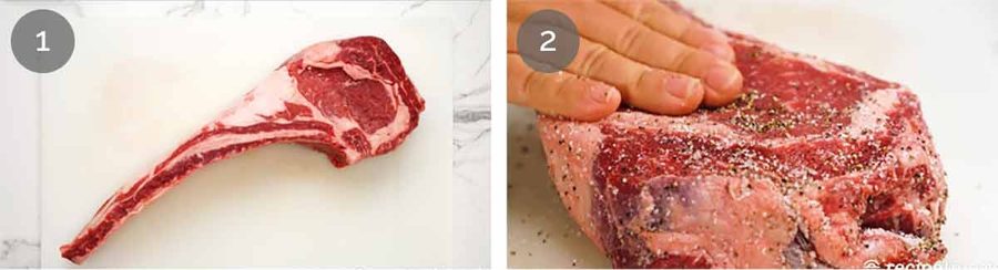 Season – Just before cooking, sprinkle the steak meat with salt and pepper, then use your hands to rub it in so it sticks better. Use most on the meat surface, some of the sides, none on the bone if it’s cleaned, or just a bit if you’ve got some meat on it (see FAQ in the Ingredients section about cleaning the bone or not).