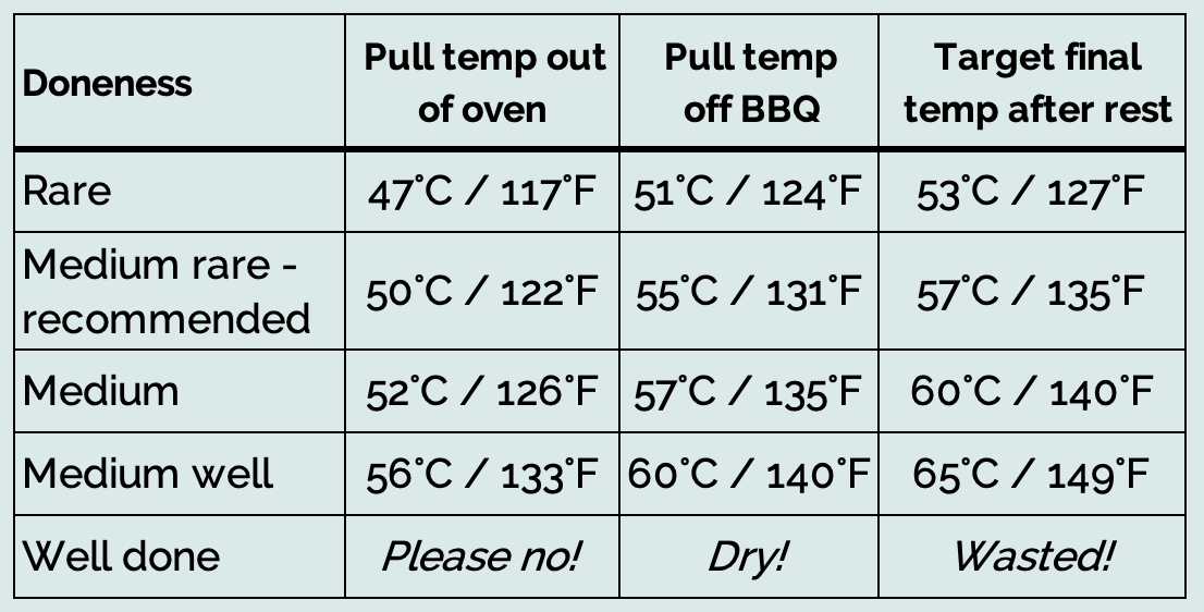 The Target Temp is the final internal temperature for each level of doneness. The Pull Temp is the temperature at which the beef should be pulled out of the oven, then off the BBQ. It will rise to the Target Temp after resting for 10 minutes.