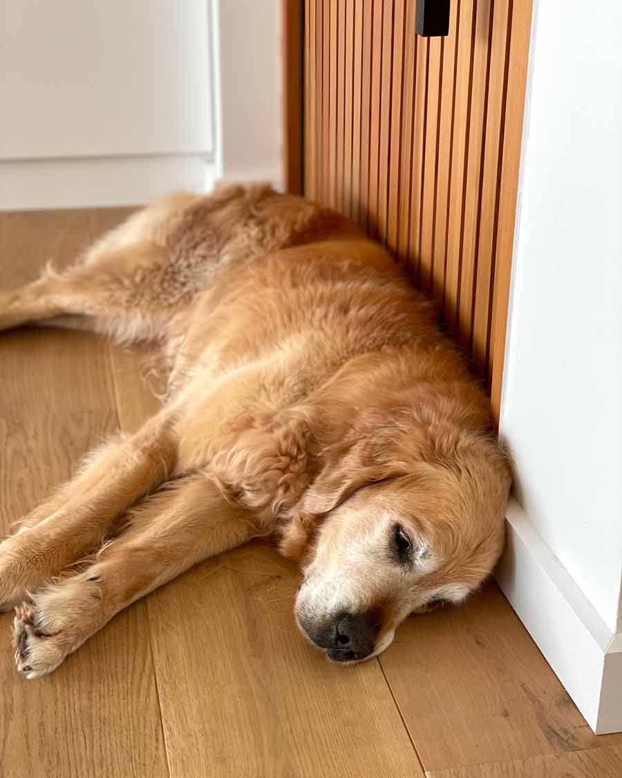Dozer in guard dog mode? Not at all. Just waiting for the next person to come through the door for ear-rubs. Nobody comes inside without giving him ear-rubs!!
