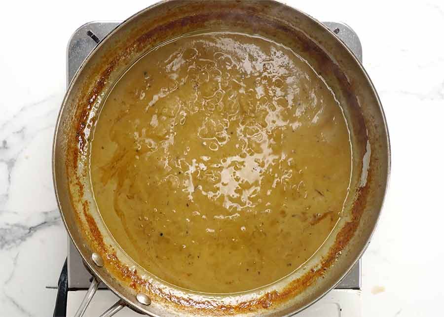 - Add vermouth and turn the heat up to medium-high. Let it simmer, scraping the base of the pan to dissolve any fond (stuck caramelised bits) into the liquid, until the liquid is almost totally evaporated. The alcohol cooks out during this step.