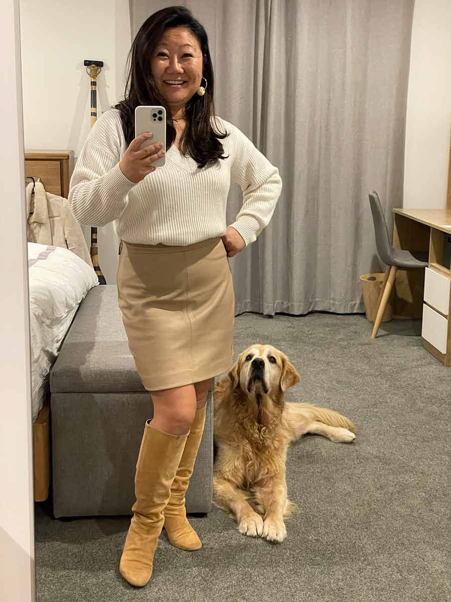 Oh, and you both look great in beige, so no need for Dozer to be worried! 🙂 Love that picture of the two of you.