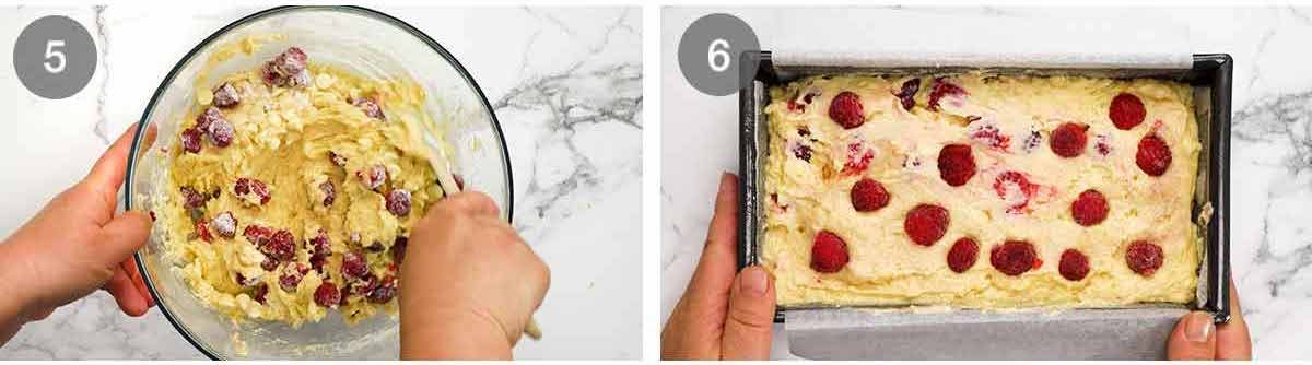 Raspberries & white chocolate – Add the white chocolate and raspberries. Stir only until the raspberries are dispersed throughout the batter, then stop mixing (see above about over-mixing).