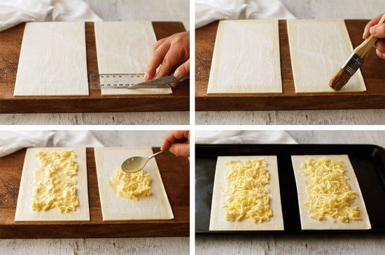 Cut the puff pastry in half. Use a knife to score a 1cm / 1/3" border (see photo below). (Note 1) Transfer to baking tray.