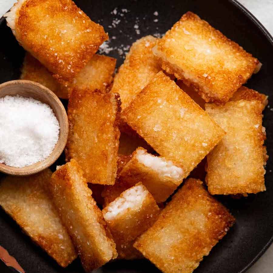Cook rice, rest, pour over seasoning, fluff. Press firmly into 20cm/8" lined pan, weigh down. Cool, fridge overnight (min 6 hrs). Cut into 15 rectangles, pan fry 4 min each side, sprinkle with salt.