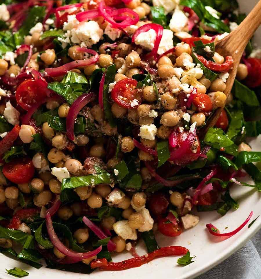 Recipe video above. Chickpea salads can be so bland... but not this one! We're marinating the chickpeas so they absorb the flavour of the lovely Greek dressing. Mediterranean flavours, bright and fresh,this works as a starch + veg side dish, or main course served with crusty bread or flatbreads for scooping!Serves 4 as a main course or 8 as a side.