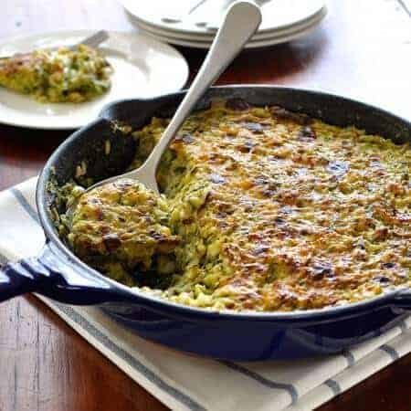 1. The alternative to sprinkling salt over the grated zucchini and letting it sweat the juices out is to sauté them in batches in the pan. This is a faster method, but you won't get the same flavour in this dish as the zucchini juices are used as the stock for this dish.2. Cooking the onions slowly makes them sweet and caramelised. You can't achieve the same result by sautéing them over high heat for a few minutes. But if you are in a rush, by all means turn up the heat and cook the onions faster.3. When heating the zucchini juice/milk liquid, be careful not to over boil which might split the milk. Just warm it up.4. The pan and baking dish need to be about 6 to 8 cup capacity. The oven proof pan I used is a 7 cup capacity pan.5. To VEGANISE: Omit the parmesan cheese, do a taste test to make sure it is seasoned enough still (as the parmesan adds salt). Sprinkle the top with panko or breadcrumbs and drizzle with olive oil so you get a "crust" on the top similar to melted parmesan (well, actually, it will be even better!!) And substitute the milk with soy (or almond milk, but I prefer soy milk because almond milk has a slightly nutty flavour).6. The medium grain white rice can be substituted with long or short grain white rice. This recipe is not suitable for: brown rice, arborio (risotto) rice, paella, basmati or jasmine rice.7. Nutrition per serving.