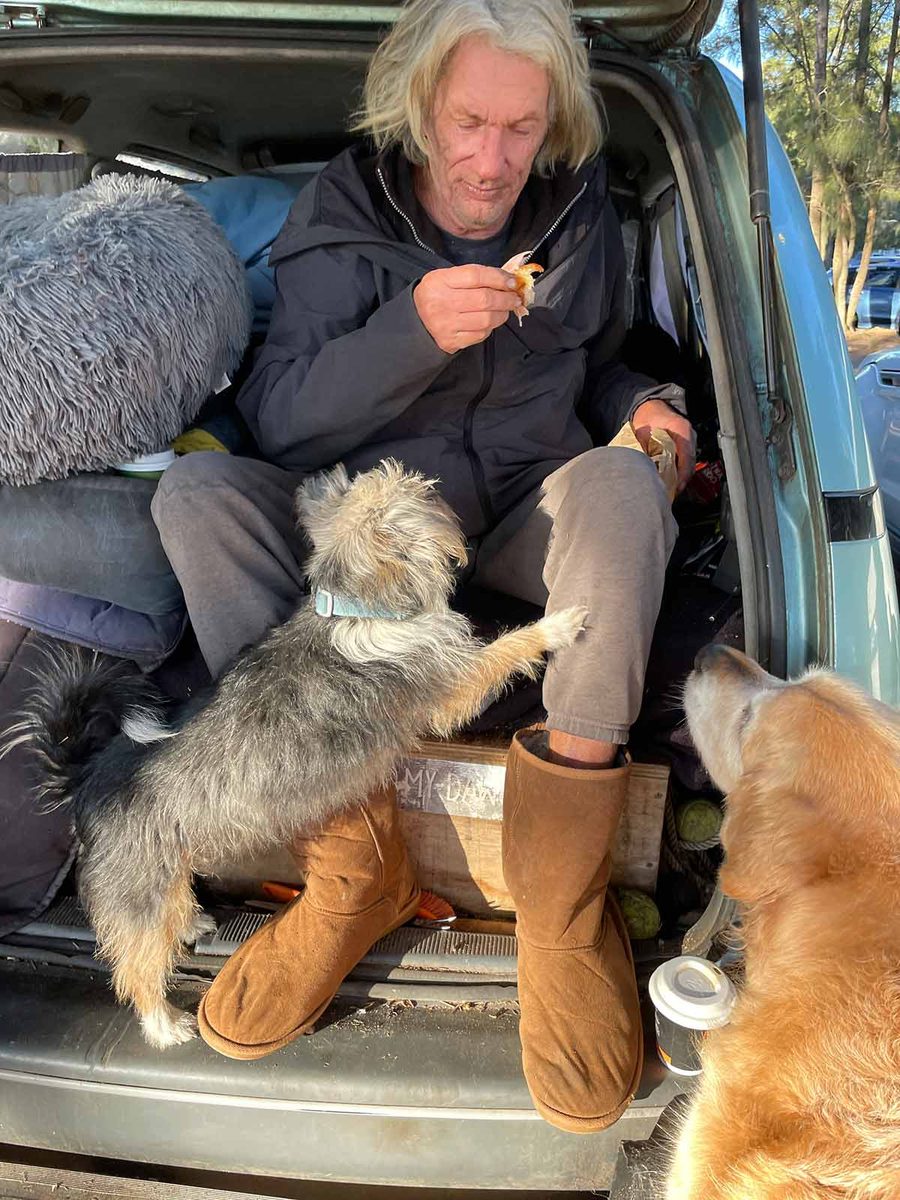 * Geoff is a local who lives in his van at the dog park/beach. He has special permission from the council to park there. He looks after the park like its his own backyard which is why it is the most pristine dog park in the whole of Sydney. He wakes up to gun-barrel views over beautiful Pittwater every morning!