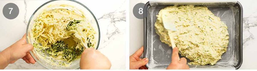 - Add-ins – Add zucchini and cheese then mix through. Some flour lumps is fine. Minimise mixing else the crumb will be tough. The batter will be thick – the zucchini will sweat more in the oven.